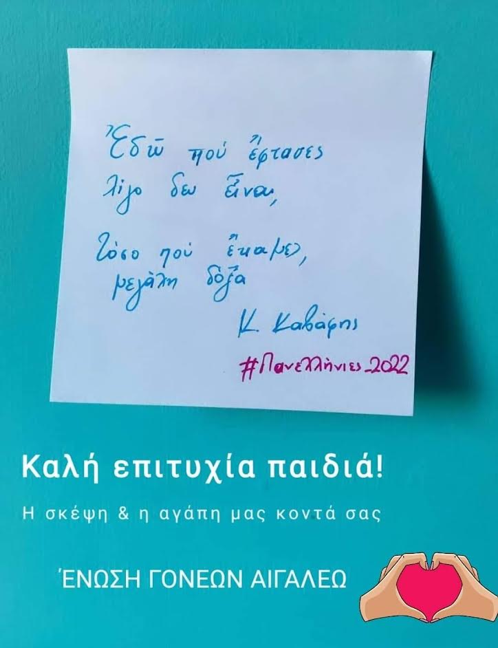 Ευχόμαστε ολόψυχα καλή επιτυχία στους μαθητές που τις επόμενες μέρες θα λάβουν μέρος στις Πανελλήνιες εξετάσεις. Να έχουν δύναμη, διαύγεια, αισιοδοξία, ηρεμία και υπομονή, έτσι ώστε να αποδώσει «καρπούς» ο αγώνας που προηγήθηκε όλο το προηγούμενο διάστημα, τα προηγούμενα χρόνια, για την κατάκτηση των στόχων τους.